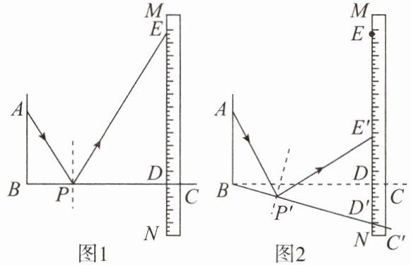 (2)将木条BC绕点B按顺时针方向旋转一定角度得到BC'(如图2),点P的对应点为P',BC'与MN的交点为D',从A点发出的光束经平面镜P'反射后,在MN上的光点为E'.若DD'= 5,求EE'的长.