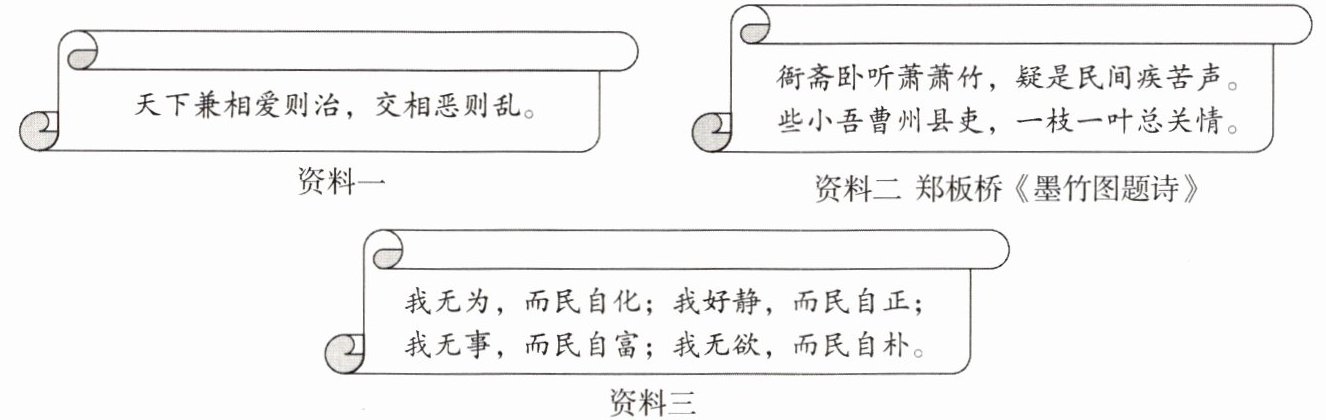 (2)资料一:墨家学派反对战争,要求人们互爱互利(“兼爱”“非攻”)的主张。资料二:儒家学派“仁”(或“仁政”)的主张。资料三:道家学派“无为而治”的主张。共同影响:促进了思想文化的繁荣,形成百家争鸣局面,成为我国古代第一次思想文化发展的高峰,为古代思想文化的发展奠定了基础,对后世产生了十分重要而深远的影响。