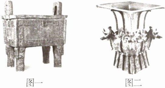(1)写出材料一中图一、图二青铜器的名称。根据所学知识,从制作工艺和象征意义两个角度概括它们的共同点。(4分)