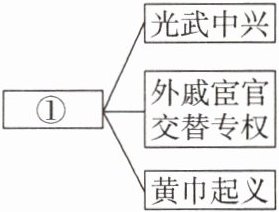(1)具体措施:政治上加强中央集权:合并郡县,裁减官员,加强对官吏的监督,惩处贪官污吏。经济上解放生产:多次下令释放奴婢,禁止残害奴婢;将荒地和山林给予农民耕种,并减轻田租。民族关系上“以德治边”:允许北方各族内迁,缓和民族矛盾。盛世名称:“光武中兴”。(2)图一:东汉中期以后,外戚、宦官交替专权的恶性循环。图二:东汉中期以后,豪强大族势力膨胀。(3)影响:沉重打击了东汉的统治,使其名存实亡。联系:外戚、宦官交替专权,豪强大族势力膨胀,使得东汉后期阶级矛盾和统治集团内部矛盾非常尖锐,时局动荡不安,社会危机不断加深,民众处于水深火热之中,反抗情绪蔓延,最终导致黄巾起义爆发。