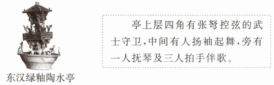 亭上层四角有张弩控弦的武士守卫,中间有人扬袖起舞,旁有一人抚琴及三人拍手伴歌。