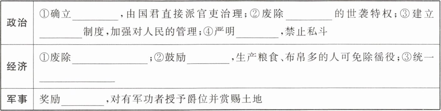 |政治|①确立______,由国君直接派官吏治理;②废除______的世袭特权;③建立______制度,加强对人民的管理;④严明______,禁止私斗|