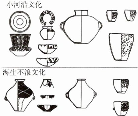 材料一:下面为新石器时代辽西小河沿文化和内蒙古中南部海生不浪文化的陶器比较图。