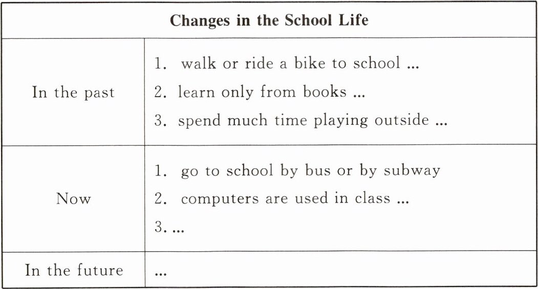 第二段:重点介绍交通方式、学习方式和课外活动方面的变化。可运用如“used to do sth./with the development of/It's+adj.+for sb. to do sth./sb. spend ... doing sth.”等表述。