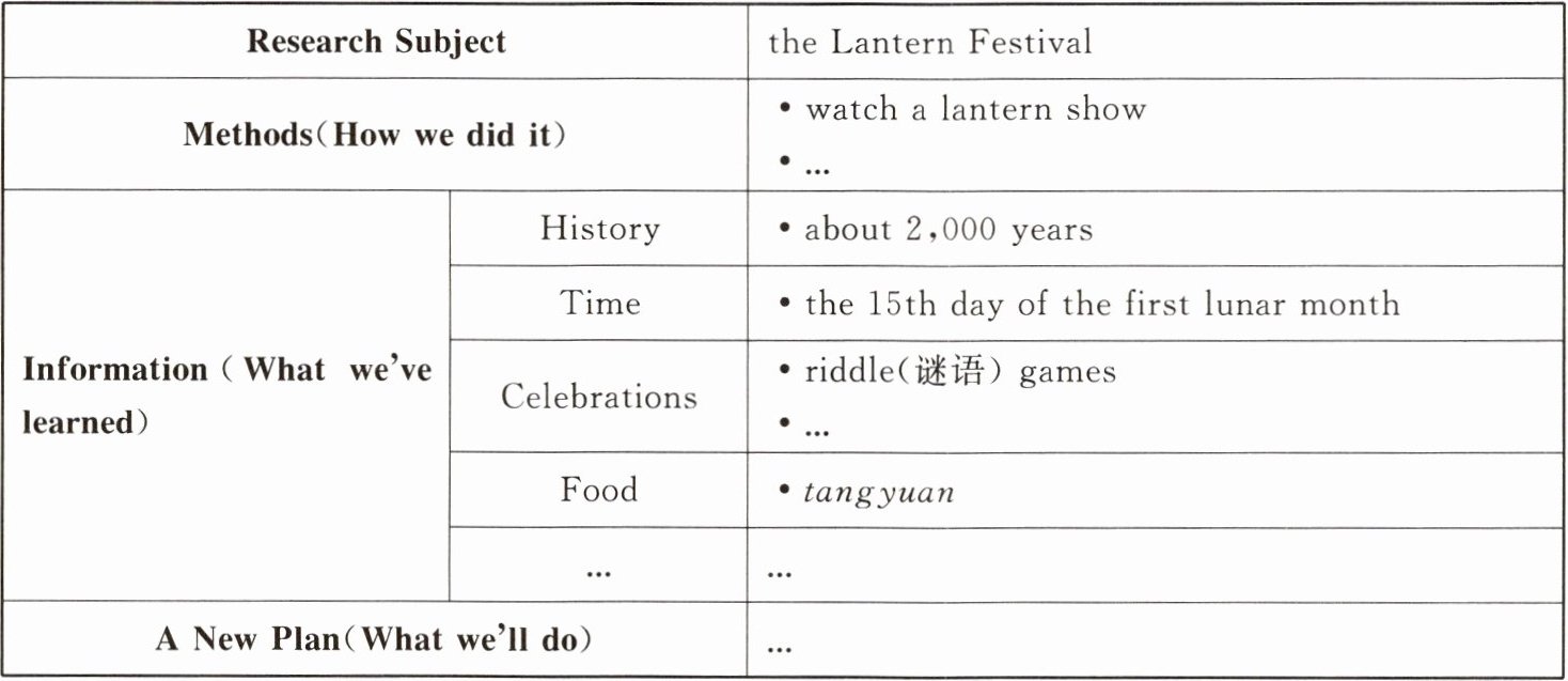 the Lantern Festival. We've collected much information about the festival by doing some reading in the library and watching a lantern show. The Lantern Festival has a history of about 2,000 years. It's celebrated on the 15th day of the first lunar month. People get together to enjoy colourful lanterns and play riddle games. Small gifts are usually offered when they get right answers. It's a tradition to eat tangyuan on this special day. As for the next step, we will focus on designing lanterns and making English riddles. This will help us understand the meaning of the festival better.