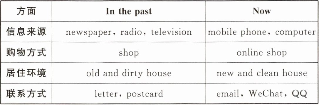 第二段: 具体描述过去和现在在信息来源、购物方式、居住环境、联系方式等方面的变化。可运用如“In the past, people .../But now people can ...”等句式。