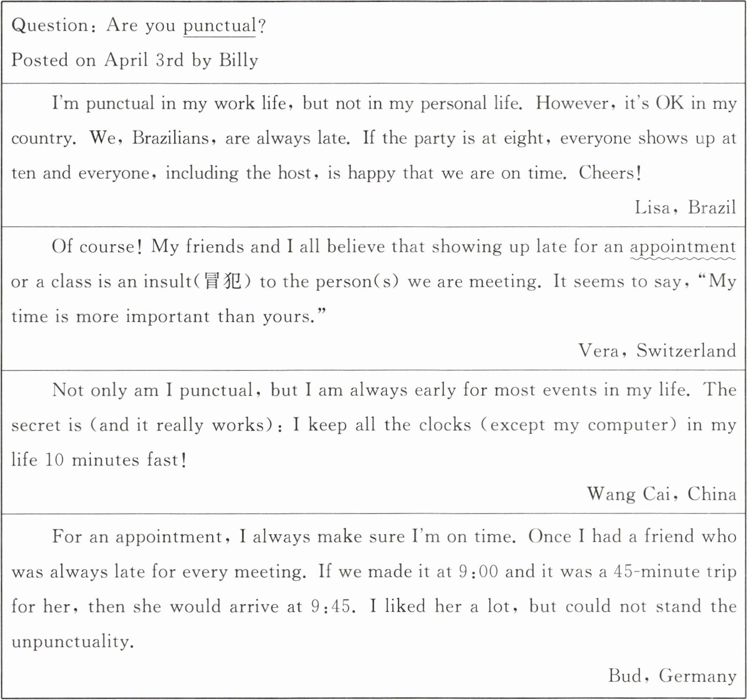 |Of course! My friends and I all believe that showing up late for an appointment or a class is an insult(冒犯) to the person(s) we are meeting. It seems to say, “My time is more important than yours.”|