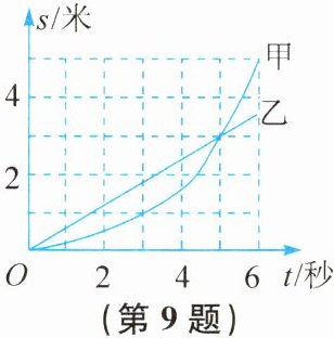 9. 甲、乙两物体运动时,路程与时间关系的s—t图像如图所示。其中甲为曲线,乙为直线,在t= 5秒时两线相交。则由图像可知( )