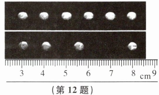 12. “频闪摄影”是研究物体运动时常用的一种实验方法。其原理是:摄影在暗室中进行。把照相机固定在地面上,快门是常开的,但是由于没有光照亮物体,底片并不感光。光源是一只闪光灯,它每隔一定的时间闪亮一次,闪亮的时间很短,只有大约千分之一秒。光源发光时,物体被照亮,底片就记录下这时物体的位置,根据底片可以研究物体的运动情况。如图是两个小球运动时的频闪照片,频闪时间间隔为0.02 s,闪亮时间千分之一秒可忽略不计。根据照片记录的小球位置,分析解决下列问题: