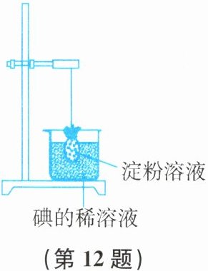 12. 现有一种由人工膜制成的袋子,为探究淀粉溶液中的淀粉和碘溶液中的碘能否透过该膜,(已知淀粉遇到碘液变蓝)用铁架台、烧杯、人工膜袋、细棉线、1%的淀粉溶液、碘的稀溶液等用品和试剂设计如右图所示的实验装置。请同学们预测实验结果并对结果加以分析。