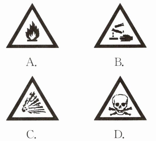 9. 下列警告标志图片贴在具有腐蚀性的试剂容器上的是 ( )
