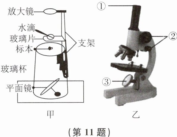 11. 利用水滴、放大镜、平面镜、透明玻璃杯和可调支架等制作了一台“水滴显微镜”(如图甲)。调节支架高度,适当调整标本、水滴和放大镜三者之间的距离,可实现与图乙所示光学显微镜相似的成像效果。