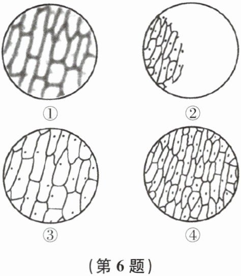 6. 如图是显微镜下观察洋葱表皮细胞临时装片的几个视野,据图回答问题。