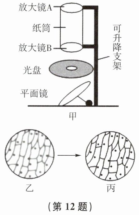 12. 小明参加学校开展的“自制简易显微镜”项目化学习活动,他利用2块放大镜(A和B)、纸筒、光盘、平面镜和可升降支架等材料制作了一台“简易显微镜”(如图甲)。通过适当调节支架高度,调整标本和放大镜之间的距离,可实现与实验室光学显微镜相似的成像效果。项目化评价小组制定的“自制简易显微镜”评价表如表。