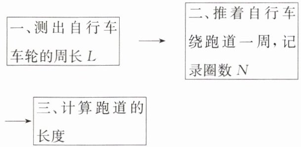 一、测出自行车车轮的周长L → 二、推着自行车绕跑道一周,记录圈数N → 三、计算跑道的长度