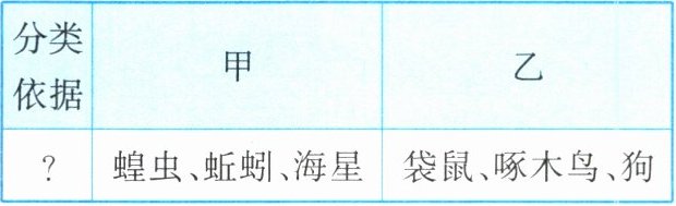 3.要把蝗虫、狗、海星、袋鼠、蚯蚓、啄木鸟进行分类,若分类结果如下表格所示,则分类依据是( )