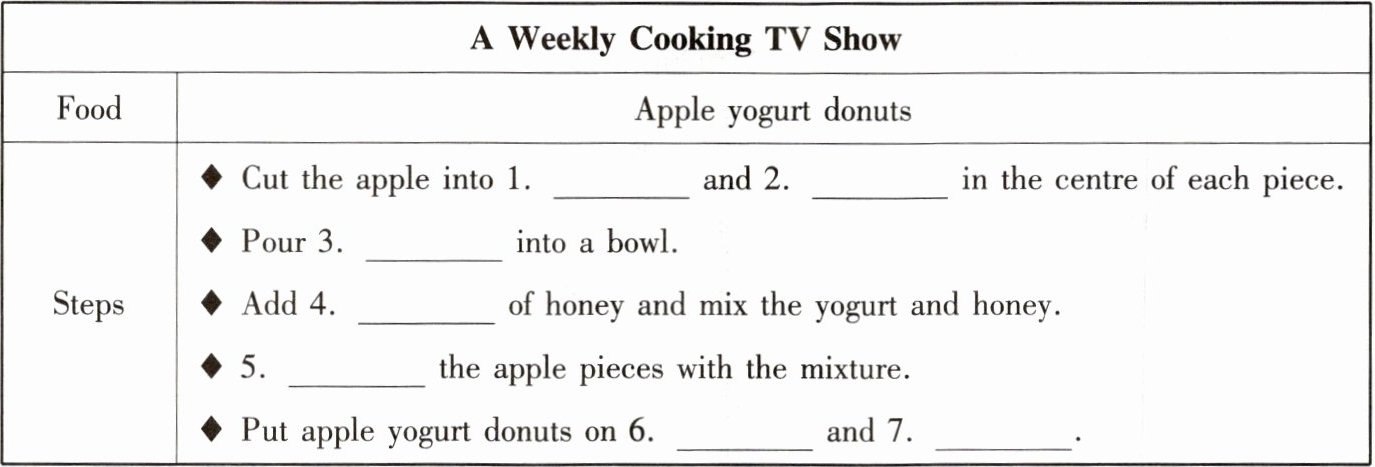 Hello everyone! This is Ms Green's kitchen class time. Donuts look cute and taste sweet, so many kids like to eat them! In this class I will teach you how to make apple yogurt donuts! First, cut the apple into thin pieces. To make the apple pieces look more like real donuts, we have to make a hole in the centre of each piece. Next, pour some yogurt into a bowl. Then add two spoons of honey and mix the yogurt and honey. After that, cover the apple pieces with the mixture. Finally, put your apple yogurt donuts on a beautiful plate and enjoy them. Have a try by yourselves. Don't forget to share with your family or friends. See you at six p. m. next Saturday.