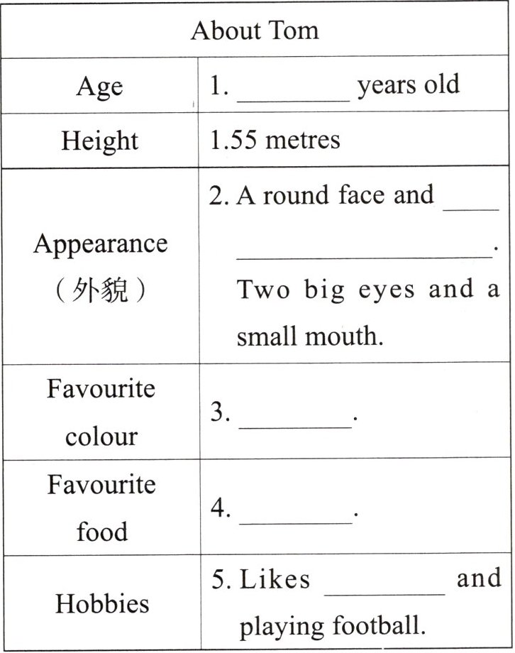 第二段(分述):Tom 的外貌、喜好和兴趣。
