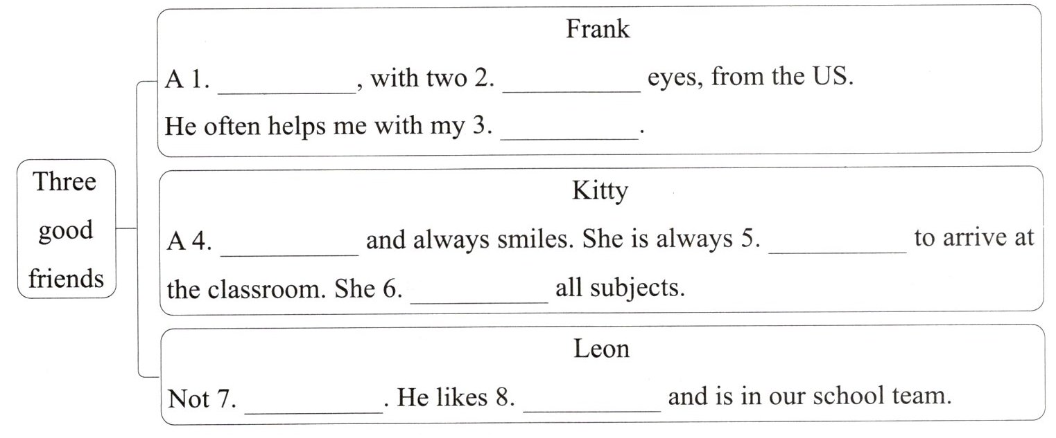 1. tall boy 2. blue 3. English 4. pretty girl 5. the first one 6. is good at 7. tall 8. football