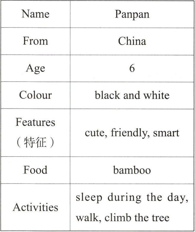 51. 动物园里有许多动物,但是你最喜欢的是大熊猫Panpan,它非常可爱,所有人都喜欢它。请根据表格中的信息,写一篇英语小短文介绍一下它,词数80左右。