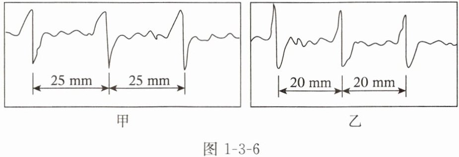 15. 心率是指正常人安静状态下每分钟心跳的次数,也叫安静心率,一般为$60\sim100次/min$。心电图上相邻两波峰的时间间隔即心动周期,也就是心脏跳动一次所需时间,由此可算出$1min$内心脏跳动的次数(即心率)。现在有甲、乙两人在同一台心电图机上做出的心电图分别如图1-3-6甲、乙所示。医生测量后记下了甲的心率是$60次/min$。