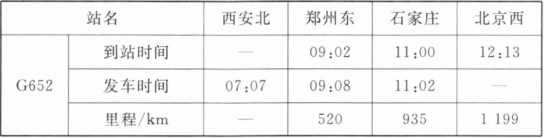 17. 高铁改变了人们的出行速度,表1-3-1是西安北站开往北京西站的G652次高铁列车运行时刻表。