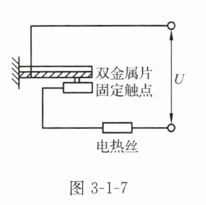 (2)如图3-1-7所示的电热设备中有一个由黄铜片和康铜片铆合在一起的双金属片温控开关,温度升高时,双金属片向上弯曲,使电路断开。请你参考上面的实验记录判断双金属片与固定触点接触的一边所用材料是黄铜还是康铜。