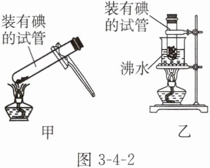 按照要求,小明设计的实验方案如图 3-4-2 甲所示,直接用酒精灯对装有固态碘的密闭试管加热;小丽设计的实验方案如图 3-4-2 乙所示,将装有固态碘的密闭试管放在沸水中加热。