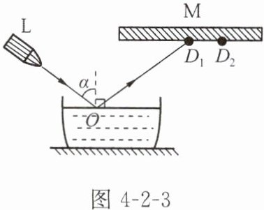 5. 图4-2-3是一种液面升降监测装置的原理图。激光笔L发射的一束激光照射到水平液面上,入射角为α。这束激光经液面反射后,照射到墙M的$D_1$点上。经过一段时间后$,D_1$点移至$D_2$点,说明液面
