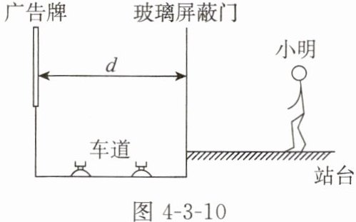 14. 如图4-3-10所示,小明站在地铁站台上,他透过玻璃板制成的屏蔽门可以看到车道另一侧竖直墙壁上的广告牌,以及自己在玻璃屏蔽门后面的虚像。小明根据该现象设计了在站台上粗测玻璃屏蔽门到车道另一侧广告牌之间距离d的实验。实验步骤如下,请完成相关内容。