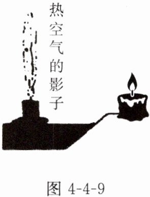 13. 你认为空气有影子吗?试一试下述实验:如图4-4-9所示,在桌上放一支点燃的蜡烛,让蜡烛距墙60 cm左右,然后把灯关上,站在离蜡烛1 m远的地方,打开手电筒使它的光照在墙上,在蜡烛影子上方有一个很淡的影子,这就是热空气留下的影子。请解释这一现象。