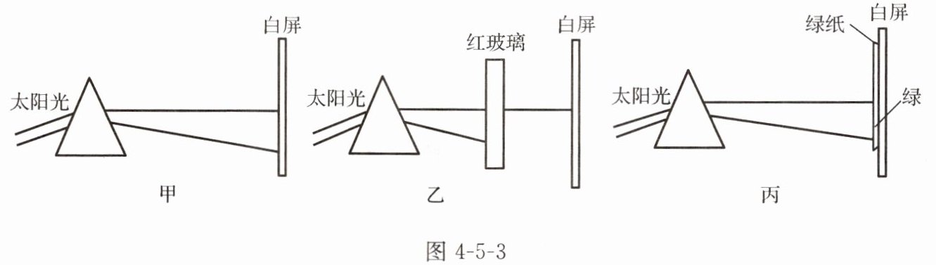 (3)在第(1)步基础上,在白屏上蒙一块绿纸,发现屏上只有被绿光照射的地方是亮的,其他地方是暗的,如图4-5-3丙所示。这一现象又说明