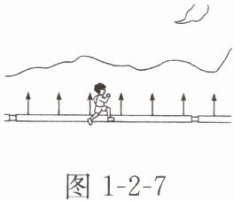 14. 观看篮球比赛视频时,我们会感觉到运动员在球场上来回不停地跑动,但实际上他们始终在屏幕上,这是为什么呢?为了探究这个现象发生的原因,小明设计并进行了如图 1 - 2 - 7 所示的实验:在小桌平面上安装一滑轨,上面放着一幅带轮子的背景画,前面放一个卡通小人。