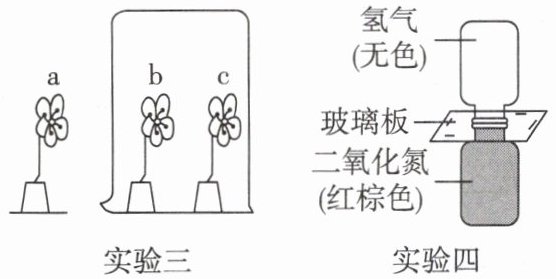 三朵滤纸做的小花 a、b、c,将 a、b 用酚酞溶液润湿,c 用浓氨水润湿,迅速扣上烧杯(如图),一段时间后观察 a 不变红,b 变红,c 不变色。