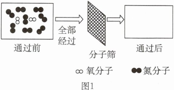 (1)如图 1 为某种分子筛型家用制氧机工作时气体变化的微观示意图(稀有气体、二氧化碳等略去),空气经过分子筛时氮气被吸附,氧气通过,请在方框中画出微观粒子图示。