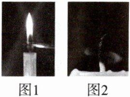 点燃两支相同的蜡烛,一段时间后,观察到均有较长烛芯露出,且发生弯曲。将其中一支蜡烛的烛芯剪掉一部分后,蜡烛仍正常燃烧,如图1。没有剪烛芯的蜡烛,火焰上方不时有黑烟(主要成分是炭黑)产生;烛芯弯曲的方向,石蜡形成缺口,蜡油外流,如图2。