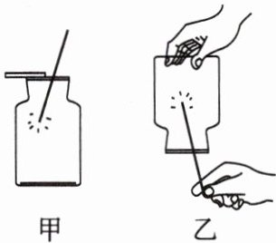 11. 悦悦想探究氧气的性质。她收集了两瓶氧气,如图所示。甲瓶瓶口朝上,乙瓶瓶口朝下,并迅速将两根带火星的木条分别伸入两个集气瓶中。