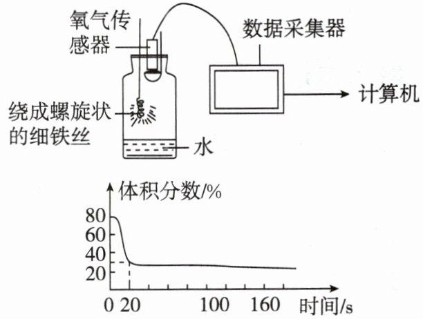 10. 柯柯使用数据采集器探究“铁丝在氧气中燃烧”,集气瓶内氧气的体积分数随时间变化关系如图所示。下列说法正确的是(