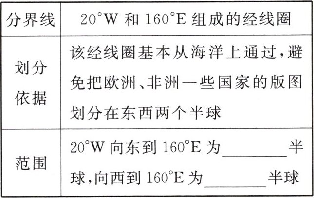 |范围|$20^{\circ}W$ 向东到 $160^{\circ}E$ 为____半球,向西到 $160^{\circ}E$ 为____半球|