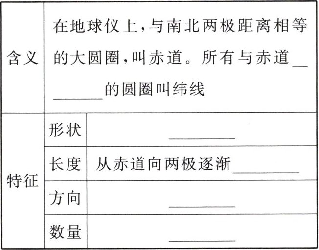 |含义|在地球仪上,与南北两极距离相等的大圆圈,叫赤道。所有与赤道____的圆圈叫纬线|