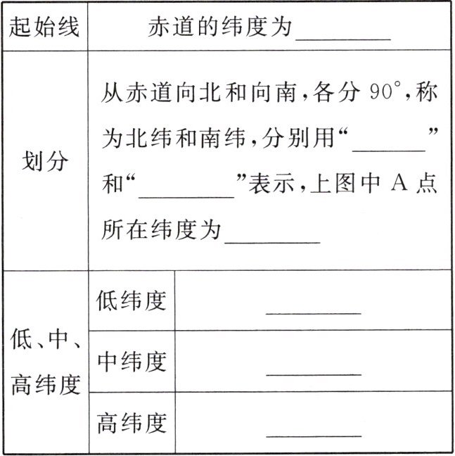 |划分|从赤道向北和向南,各分 $90^{\circ}$,称为北纬和南纬,分别用“____”和“____”表示,上图中 A 点所在纬度为____|