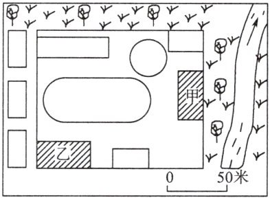 小明画了一幅校园平面图让老师看,老师说这幅图有一处明显的错误,请讨论并指出这处错误。