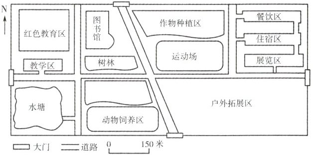[新情境・生活情境]某日,兰州某中学组织学生前往附近某综合实践基地开展主题活动。下图是实践基地平面图。读图,完成 7~8 题。