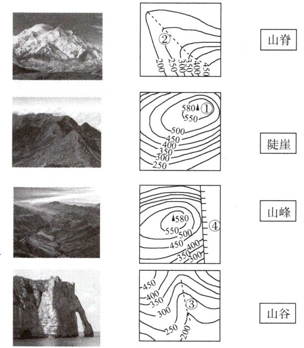 (第一幅景观图)—①—山峰;(第二幅景观图)—②—山脊;(第三幅景观图)—③—山谷;(第四幅景观图)—④—陡崖