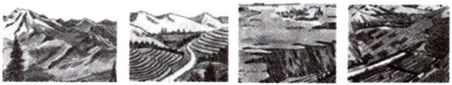 4. 我们学了五种基本地形类型,除了平原外还有下面四种,请依次说出它们的名称。( )