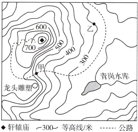 6. A 7. C 解析:甲地等高线向海拔高处凸出,为山谷;甲地比乙地等高线密集、坡度大;依据"上北下南,左西右东"的一般定向法判定方向,甲地位于乙地的西南方;图示等高距为50米,甲地海拔为450米,乙地海拔为300米,两地相对高度为150米。8. B 解析:读图分析可知,水库位于山谷中;公路沿山谷线蜿蜒而上;龙头雕塑位于山脊上;轩辕庙东南侧等高线密集,山体陡峻。