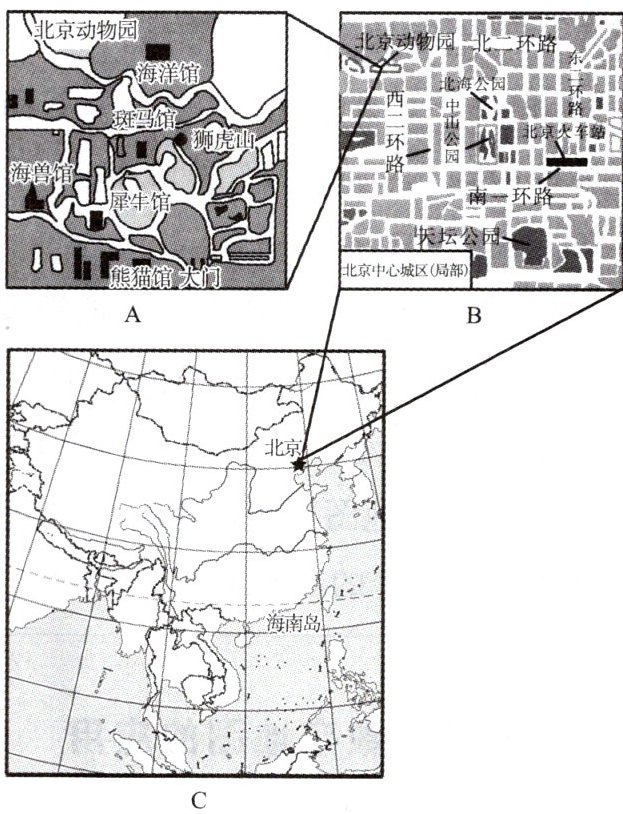 随着生活水平的提高,人们对旅行的热情也逐渐提高。只要一有时间,在经济条件允许的情况下,很多人会来一场说走就走的旅行。河北的小张想开私家车去北京游玩。他想先去天安门,再去北京动物园转转。下图是他翻看的不同区域的地图。根据材料,探究下列问题。