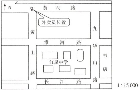 [新考向·生活情境]书店老板点了一份外卖餐,查询手机软件后,了解到外卖员的位置。读图,完成 6~8 题。
