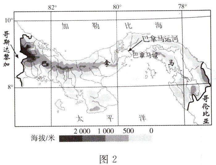 - [核心素养·综合思维] 巴拿马因其重要的地理位置而被誉为“世界桥梁之国”。巴拿马运河则有“海上桥梁”之称。图 1 为巴拿马运河位置示意图,图 2 为巴拿马地图。读图,完成 10~11 题。