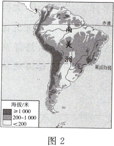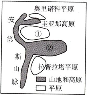 (2)南美洲西部高大山地以东,地域辽阔,______(地形类型)与高原相间分布。玲玲绘制了南美洲的地形简图,图中①②代表的地形区分别为______、______。